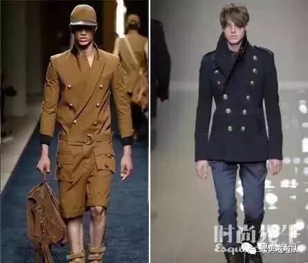 在军装风的服装中,金属扣也是十分常见的元素。金属扣体现军装庄重感的同时,也彰显了高贵的皇室风范。金属扣通常与比较坚挺的面料搭配,勾勒男性硬朗挺拔的线条。