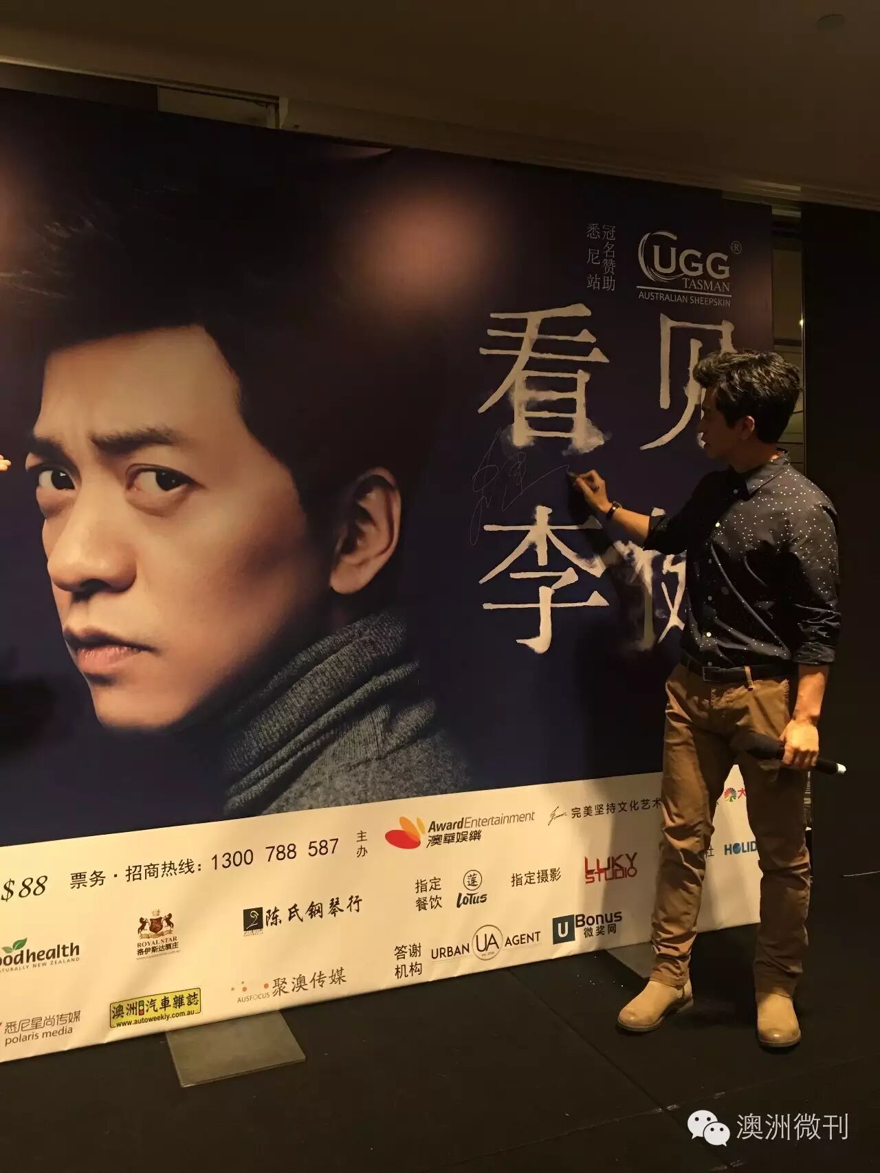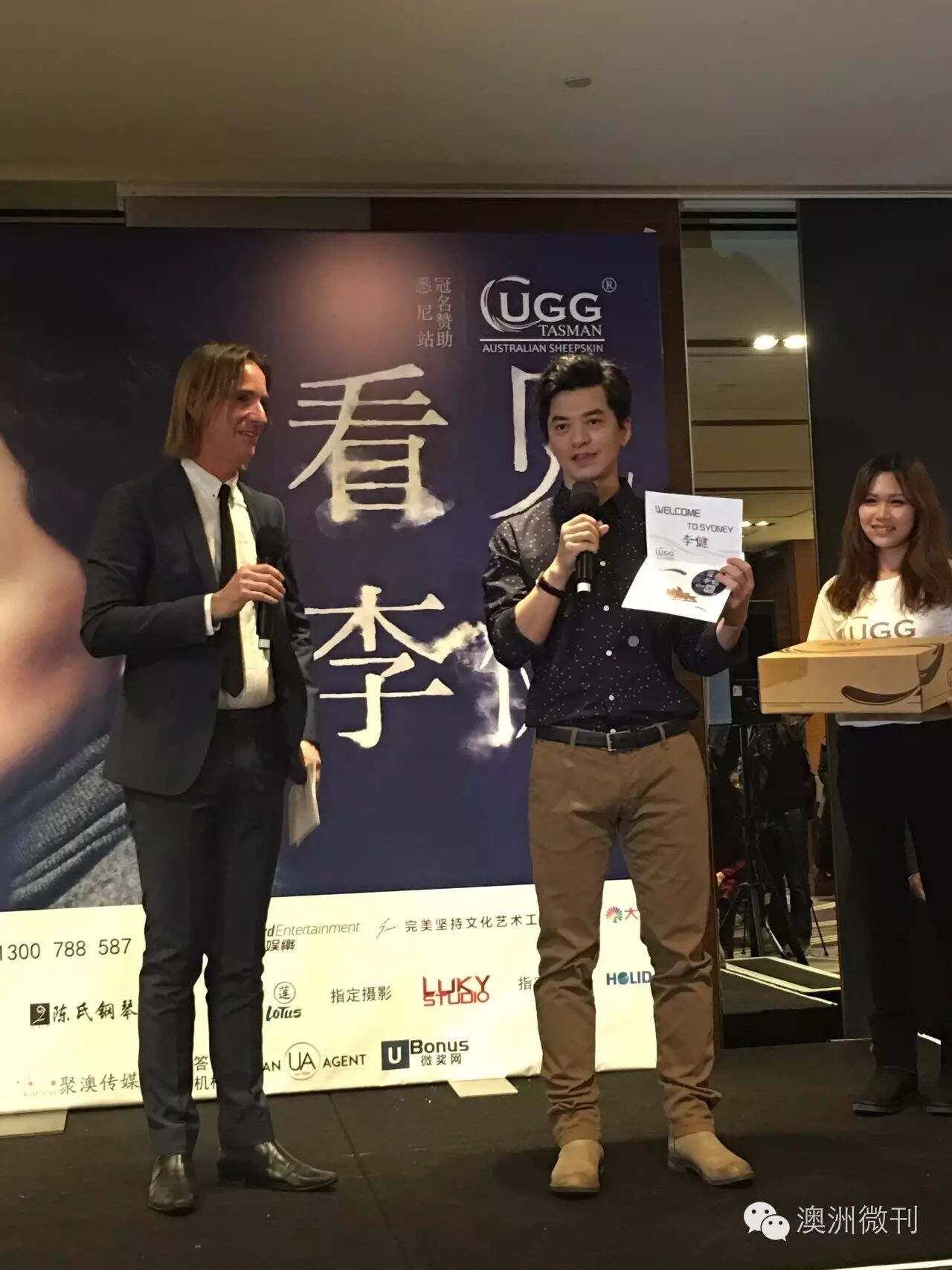 本次李健世界巡回演唱会(澳洲站)由UGG冠名赞助。UGG代表发表讲话,表达了对李健的热烈欢迎以及对演唱会的美好期待,代表与李健交换礼物,掌声再次响满了会场。