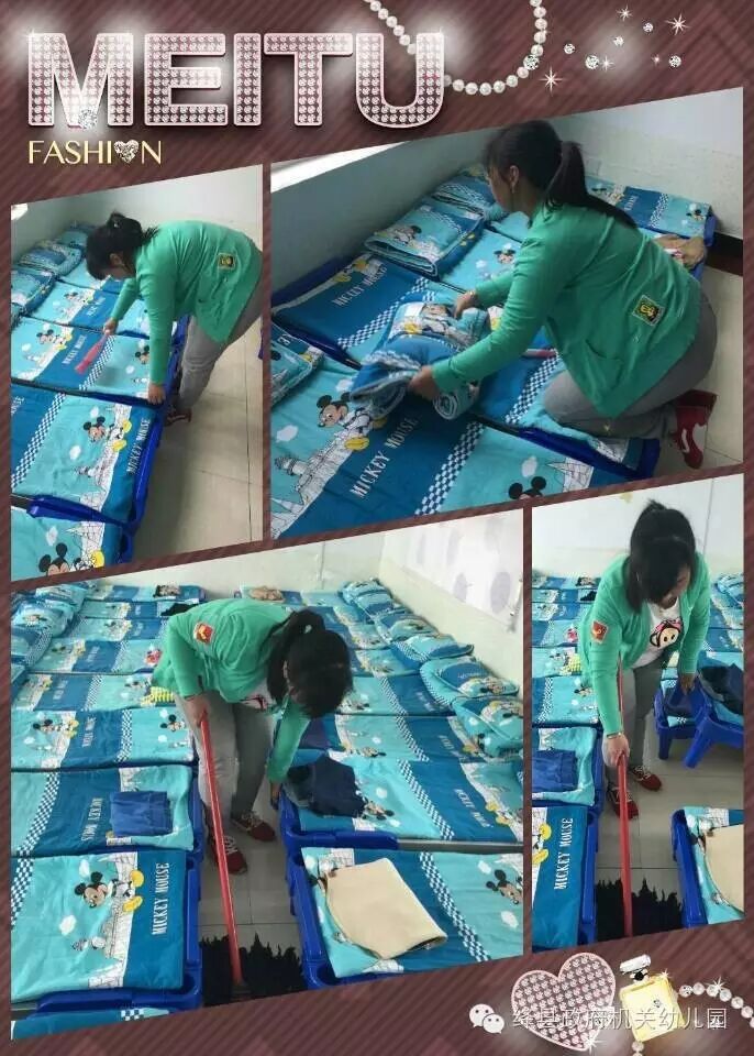 她在幼儿午睡后积极整理幼儿床铺,做好寝室清洁消毒工作,使幼儿寝室整洁舒适。