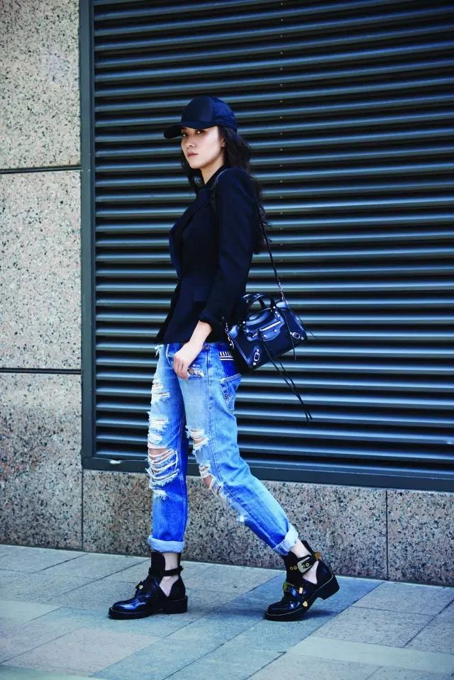 今年流行的磨边牛仔裤搭配西服,时尚休闲~