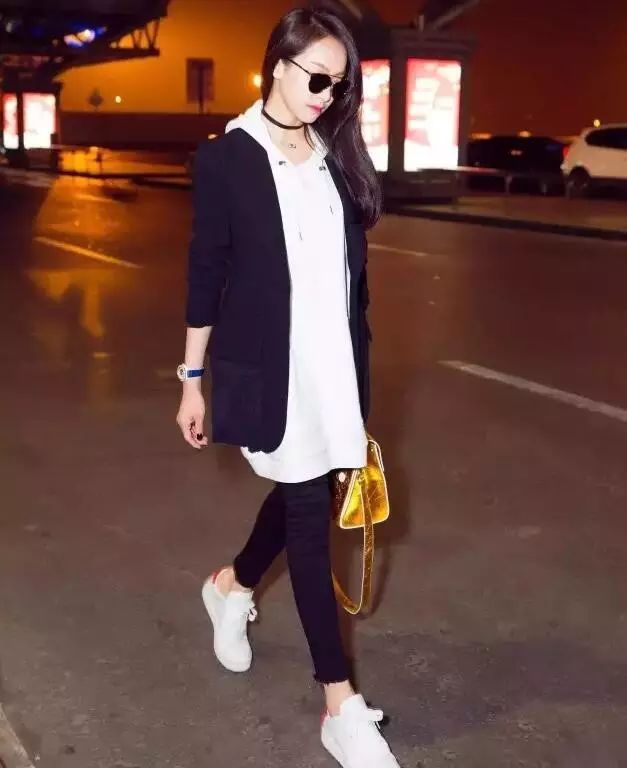 宋茜,黑色西装内搭卫衣,黑色牛仔小脚裤与白色运动鞋!吸睛又青春无敌!