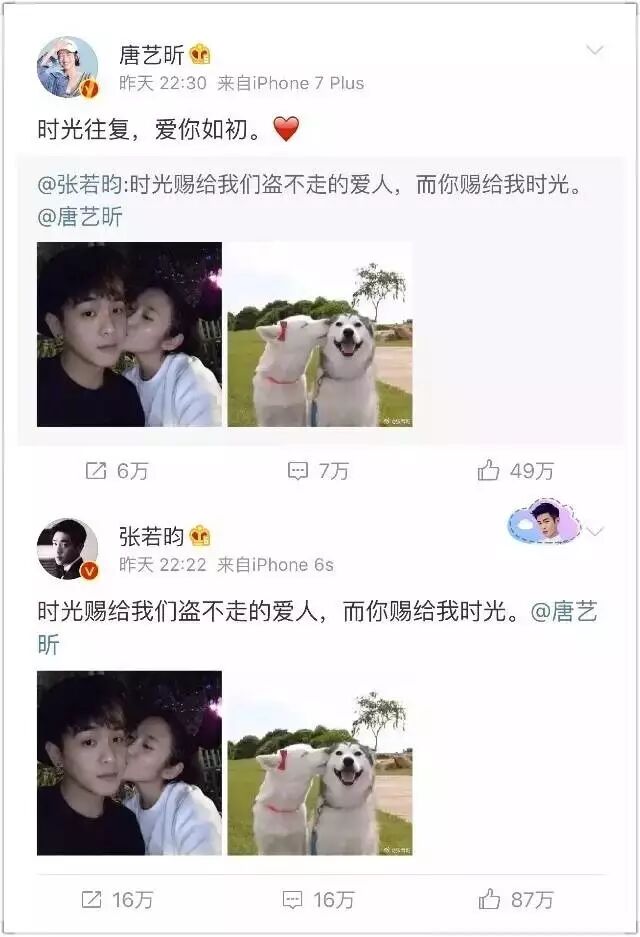 他们一起养狗、一起撸串、一起旅游,像所有普通的情侣一样,虽然一直低调恋爱,连一张同框高清秀恩爱的图都找不出,但彼此又会在微博上隔空互动回应着对方,发着只属于他们的“情侣款”微博,记录着每一次美好。