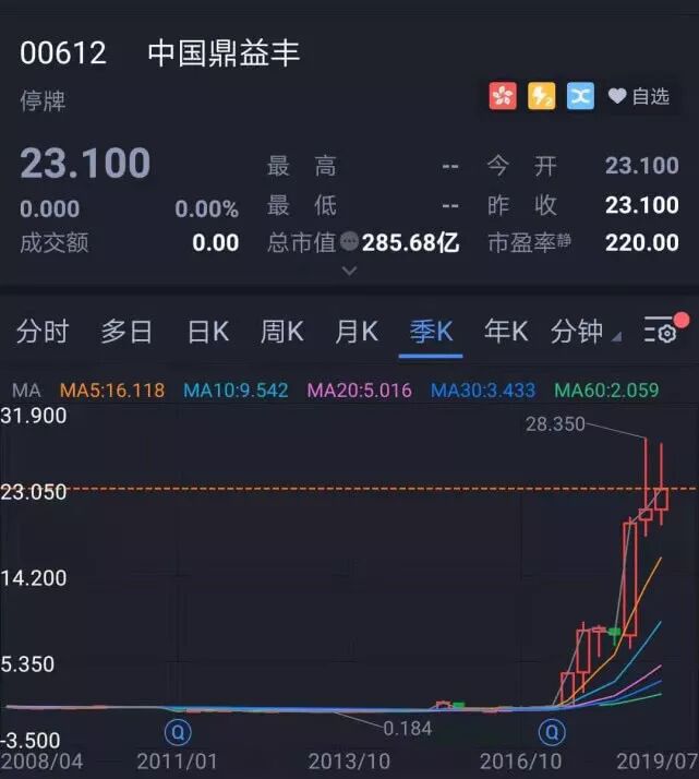 2018年11月2日,当时公司名字还叫“中国投资基金国际控股有限公司”的中国鼎益丰在盘中股价达到了其历史最高值——28.35港元。往前倒推不到三年,即2016年1月份的某一个交易日,这个股票的收盘价格仅为0.281港元,这意味着,三年不到的时间里,其股价上涨了100多倍。