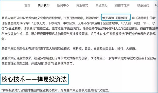 在鼎益丰集团的官网上,“禅易投资法”被视为鼎益丰集团的企业核心技术,并称这种“独特的东方价值投资学”由隋广义在1997年创立。