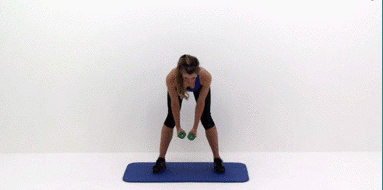双腿打开与肩同宽,双臂拿起哑铃,下压贴于地面两侧,起身的时候双肩向后舒展。