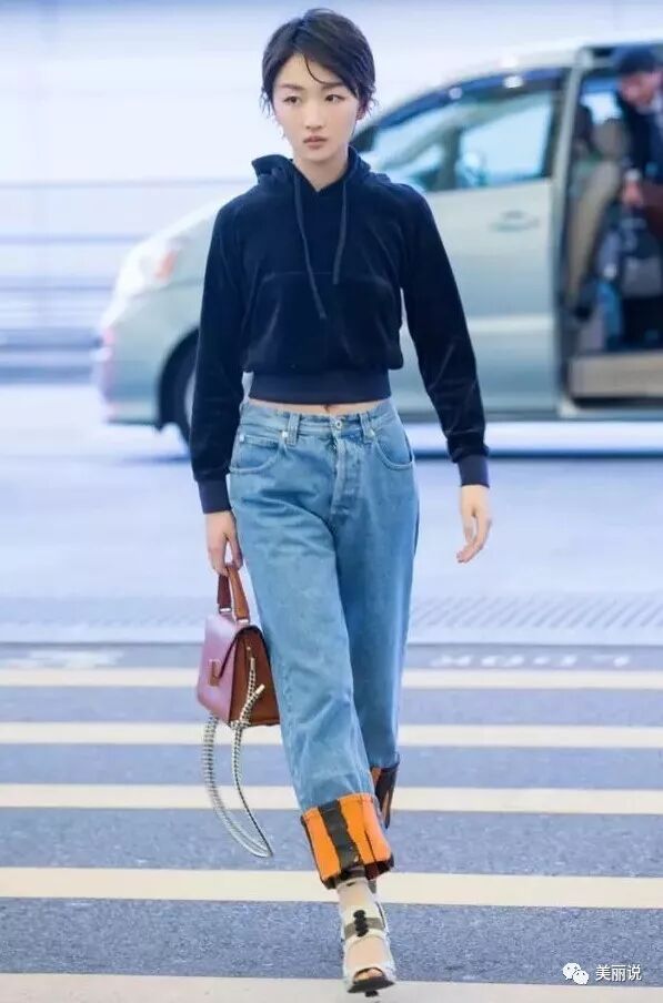 同样中性风的造型换上高跟鞋气场足了不少,破洞或是翻折的牛仔裤都提升不少时髦感。