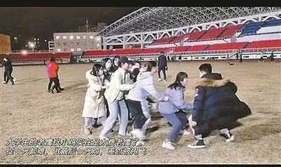 「鷹と雛の追いかけっこ」をする哈爾浜(ハルビン)工業大学の学生たち。