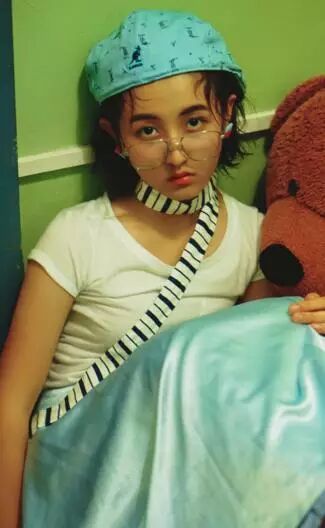 白色体恤,淡蓝色的裙摆将张子枫塑造成一个宅女,但是简单的眼镜配饰又让人不由的和优秀的学霸联系到一起,画风极好;