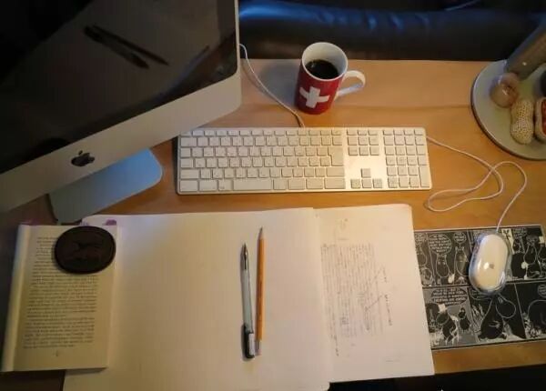 每天早上四五点起床,到厨房里热一壶咖啡,倒进大大的马克杯里,端着杯子在书桌前坐下,打开电脑,然后开始左思右想,伏案工作四五个小时。
