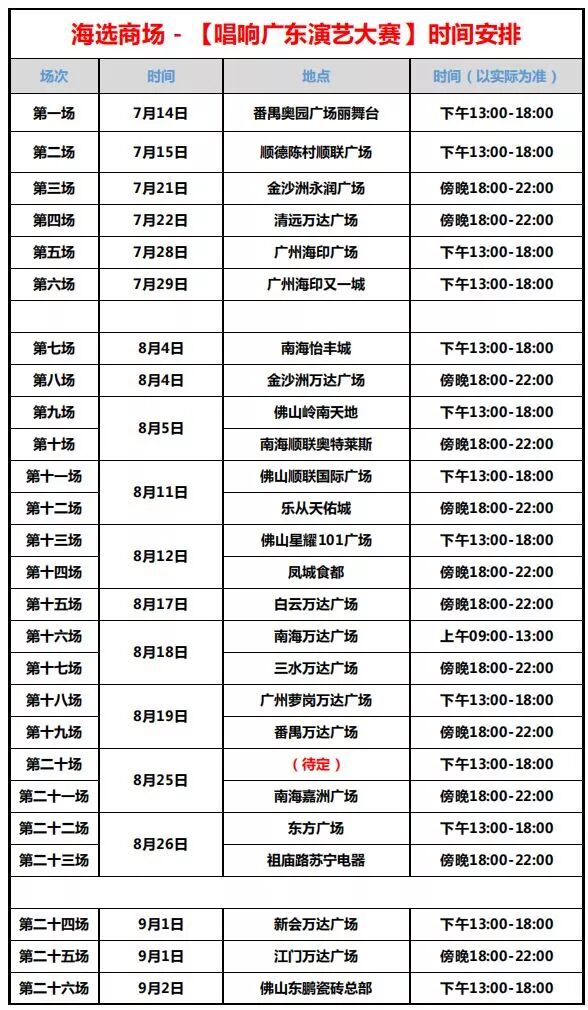 从7月14日起在广东20多家人气商场先后展开,“海选活动”将持续到9月2日。预计吸引数以万计市民参与,燃起全广东的演艺才艺大比拼热潮!各地方报名海选火热进行中,你就是演艺之王!