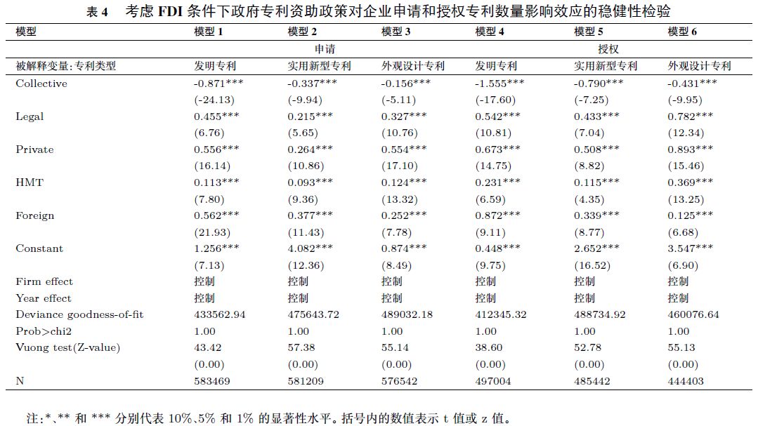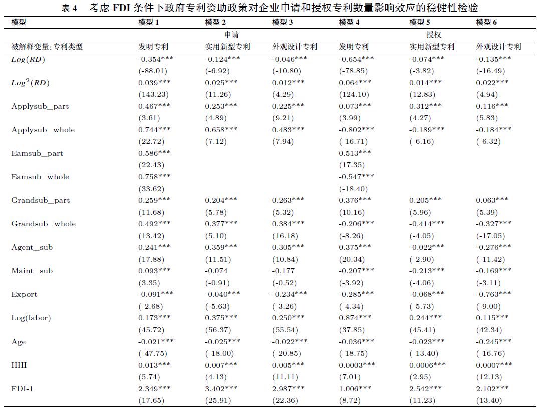 针对此问题,本文在计量方程(6)式中纳入中国各省份地区上一年的FDI变量,该变量定义为各省份地区各年份所获得FDI金额和GDP的比值。表4报告了相应的回归结果,从中可以看出:一方面,无论是从企业专利的申请角度还是授权角度来看,在三种不同专利类型的样本组中,中国各省份地区外资进入变量FDI在1%统计水平上均显著为正。这就表明,在那些外资进入越多的省份地区中,企业专利申请或授权数量就相对越多,从而表明FDI进入因素的确对中国企业专利活动造成了显著的正向促进效应。另一方面,在控制了中国各省份地区FDI进入这个重要影响因素的情形下,无论是在企业专利申请还是专利授权的样本组中,无论是在发明专利还是实用新型和外观设计专利类型的样本组中,中国各省份地区的政府资金资助、补贴和奖励政策各个环节的虚拟变量系数的符号和显著性,也均未发生本质性变化。这表明,中国情景下,FDI进入因素所带来的综合正面效应,并不能全部解释中国专利爆炸式增长之谜,中国省份层面政府积极出台的各种类型政府资金资助、补贴和奖励政策,其内在目标或动机不仅仅是应对FDI进入所带来的竞争作用,可能还有更为多样化和深层次的内在动机和推动因素有待挖掘。