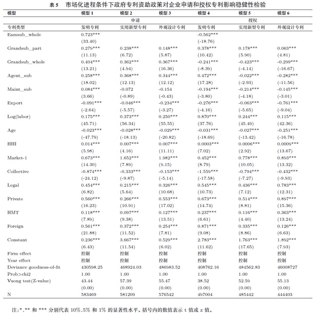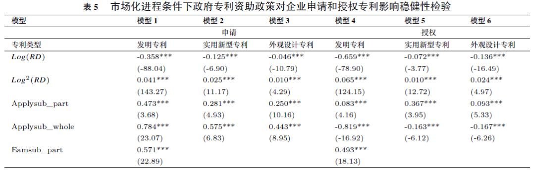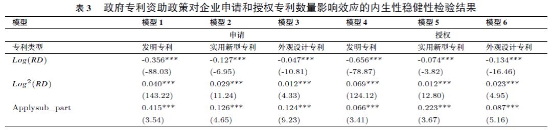 以上的一系列实证结果说明,在对那些企业三种类型专利申请的各个环节实施全额政府资金资助、补贴和奖励政策的省份地区中,企业获得的三种类型专利的授权数量相对越少。从而揭示出的基本事实是:一方面,对企业专利申请的各个环节费用实行全额资助的话,会大幅降低企业专利申请和维护的成本,刺激企业将那些质量相对低下或者无效的专利进行申请,导致企业专利申请的逆向选择行为;另一方面,尽管中国各省份地区的各类政府资金资助、补贴和奖励政策虽然激发了企业专利申请数量的快速增长,但是国家知识产权局作为企业申请专利有效性以及专利质量的甄别者、筛选者和最后把关者,在很大程度上还是起到了“最后一道防线”的把关责任,对企业低质量专利申请以及无效专利起到了一定程度的甄别作用,对中国各省份地区由于政府资金资助、补贴和奖励政策所造成的企业专利申请活动中的逆向选择行为形成一定的遏制作用。因此,以上实证结果较为合理地回应了本文提出的研究问题2。