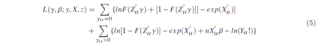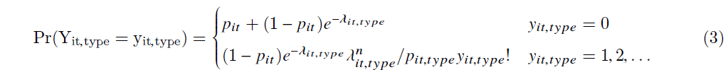 针对中国情景下企业专利活动的实际情况来看,一个突出的现象是,笔者的有效企业样本中约有82.7%的企业没有任何专利活动,这就会造成采用的负二项方法以及PQML方法得到的估计结果存在很大偏差。而且,笔者的有效企业样本中也约有81.9%的企业没有创新研发投入。有研究文献表明,企业的创新研发活动和企业专利活动之间有着密切的联系[10]。对此,笔者假定企业可以区分为两种类型:有创新研发活动和没有创新研发活动的企业。假定企业不进行创新研发活动的概率为p,企业进行和获得专利的数量则为零;企业进行创新研发活动的概率则为(1-p),企业进行和获得专利的数量则大于零,则其服从(2)式的泊松分布。由此得到如下式(3)形式的模型: