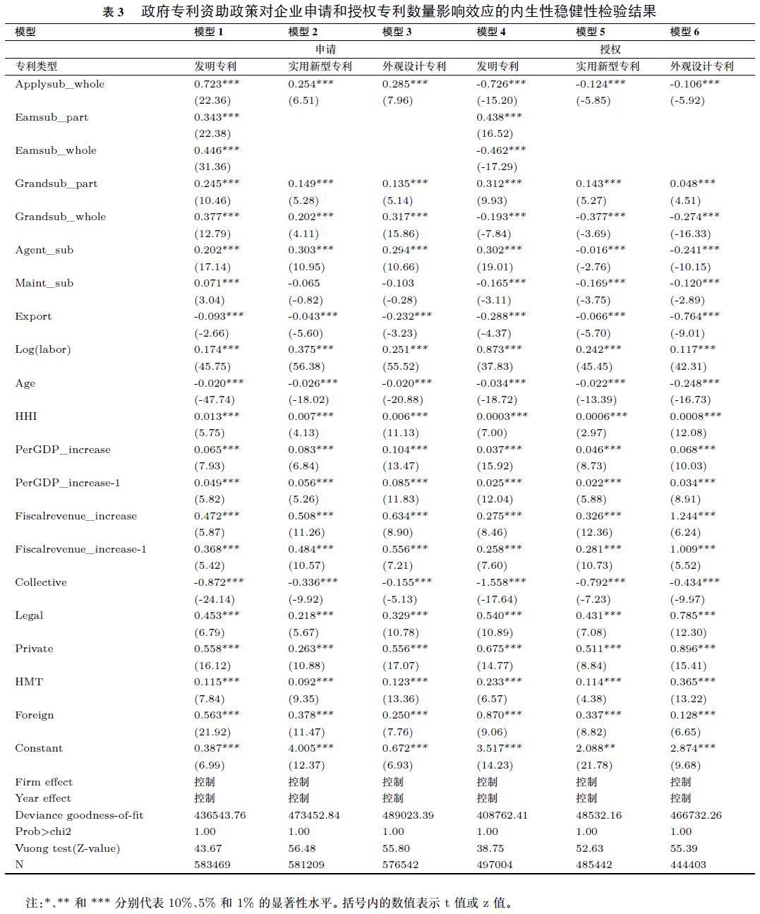 本文计量方程(6)所面临的内生性问题就是中国情景下作为解释变量的各省份地区政府专利资助、补贴和奖励政策与作为被解释变量的企业专利申请活动之间可能存在由于逆向因果关系而造成的内生性问题。针对这种因素可能产生的内生性问题,笔者认为,从中国各省份地区制定和出台各种专利资助、补贴和奖励政策的内在动机来看,主要是贯彻国家层面的“专利促进工程”的创新追赶战略,响应国家的创新驱动发展战略。基于这样的基本事实,笔者的基本判断是,相对于中国各省份地区中分散的、个体化的微观企业而言,单个企业只能是依照各省份地区政府专利资助、补贴和奖励政策的力度、方向以及政策的调整变化信息,来主动权衡、决策、选择企业自身的专利申请行为。因此,本文设计的用于衡量中国各省份地区专利资助政策的变量,相对于各地区中的个体企业来说,在很大程度上应该是一个外生性的政策变量,可能并不会导致二者之间的逆向因果关系以及由此带来的内生性问题。