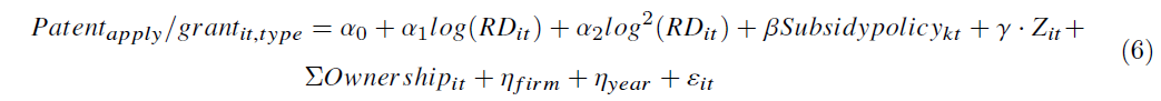 上式中,因变量Patentapply和Patentgrant分别指示为企业i在t年的三种不同类型专利的申请数量以及授权数量。从企业创新活动投入与产出的角度来看,在计量方程(6)式中,需要对决定企业专利产出的企业研发投入变量加以控制,因此,笔者在计量方程(6)式中纳入了企业研发投入额的自然对数值log(RDit),具体按照log(1+RDit)的方法计算。正如既有文献所关注到的是,企业研发投入和专利产出之间可能存在非线性的作用关系,为此,笔者在计量方程(6)式中还纳入了企业研发投入额自然对数值的平方项变量log2(RDit)。对于本文所关心的核心解释变量——中国各省份地区的政府专利补贴和资助政策而言,为了捕捉和刻画中国各省份地区的各种类型以及各个环节专利补贴和资助政策的差异性,笔者设置了反映1999–2009年期间中国各省份地区出台的三种类型专利补贴和资助政策变量Subsidypolicykt。