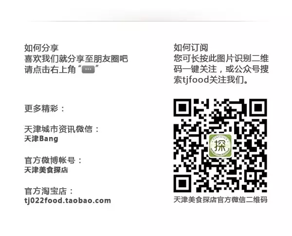 如果希望订阅我们的美食推荐,请关注微信号:tjfood ,如果喜欢这篇美食文章,欢迎分享到您的社交媒体上与小伙伴们一起分享;