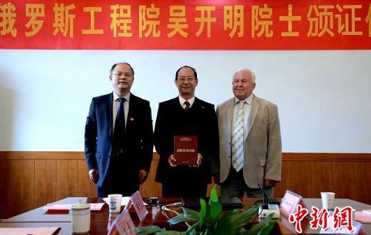 3月16日,武汉科技大学国际钢铁研究院常务副院长、湖北省“楚天学者”特聘教授吴开明当选俄罗斯工程院外籍院士颁证仪式在该校青山校区举行。俄罗斯工程院切波列夫院士专程来武汉,为吴开明颁发院士证书、院士证和院士徽章。