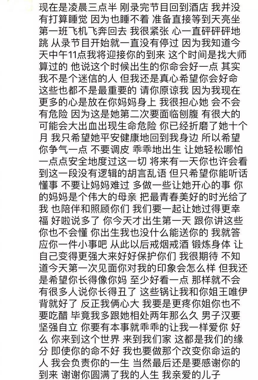 8月14号,王栎鑫发了一条微博,一张捧着刚出世儿子小脚的照片,还附了一张自己的朋友圈长文截图。每天在微博怼苏醒、怼黑粉、黑自己老婆孩子,一直以为王栎鑫是个怼天怼地的画风,突然这么煽情还挺不适应的。