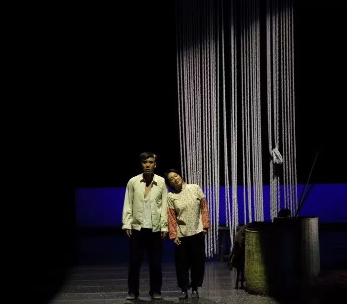 剧中有几个动作设计让我眼前一亮,一个是表现六团和鞠生成亲时,红绸在六团身上反复裹上又展开,一裹一展间,不情不愿的表现实在巧妙;一个是村民们在河边发现尸体时,直接用竹竿和衣服来表现;最后一个是在结尾,六团跳河后所有女演员化身成鱼一起舞动的场景。这几个场景不禁让人感慨,原来还有这种操作!