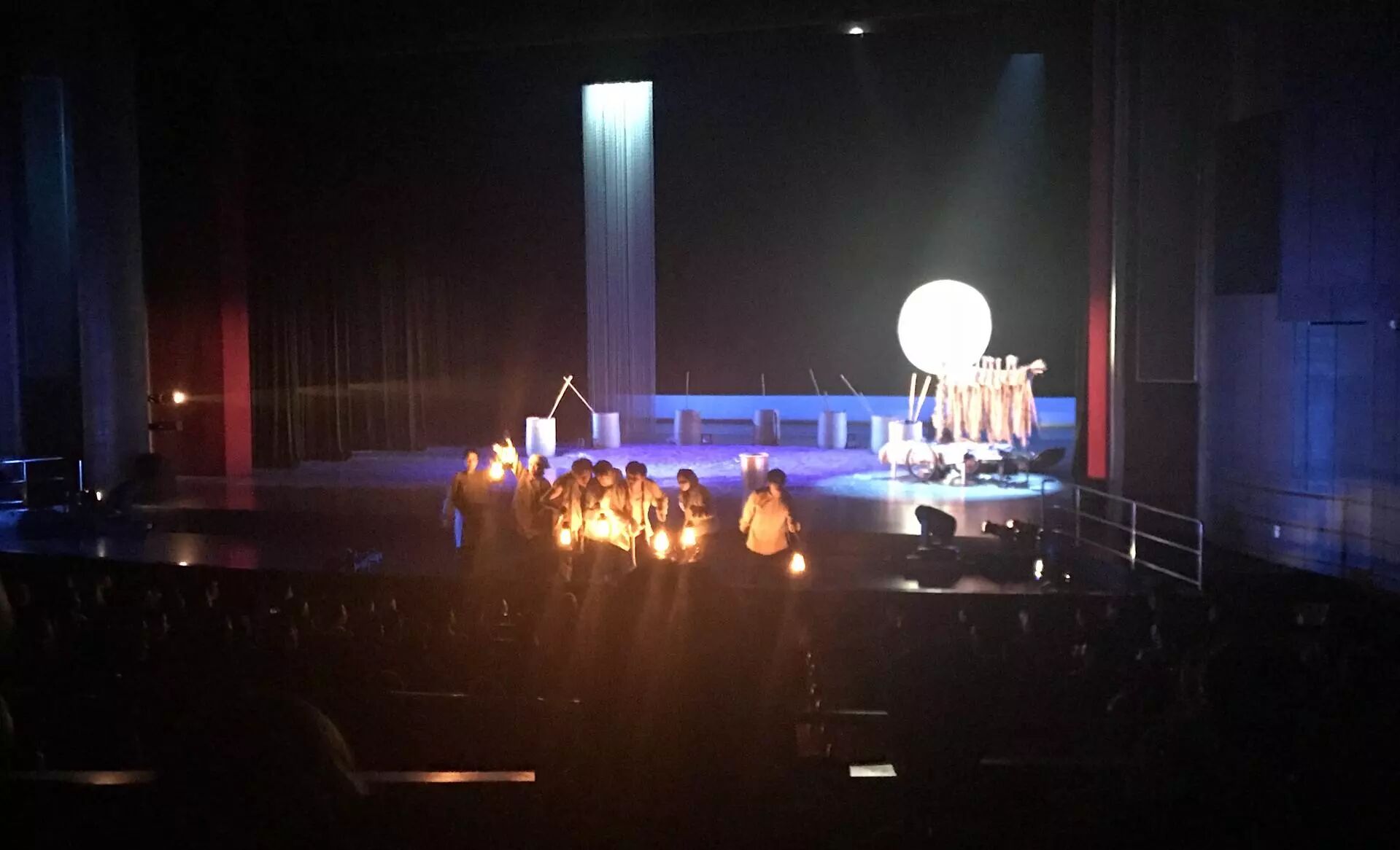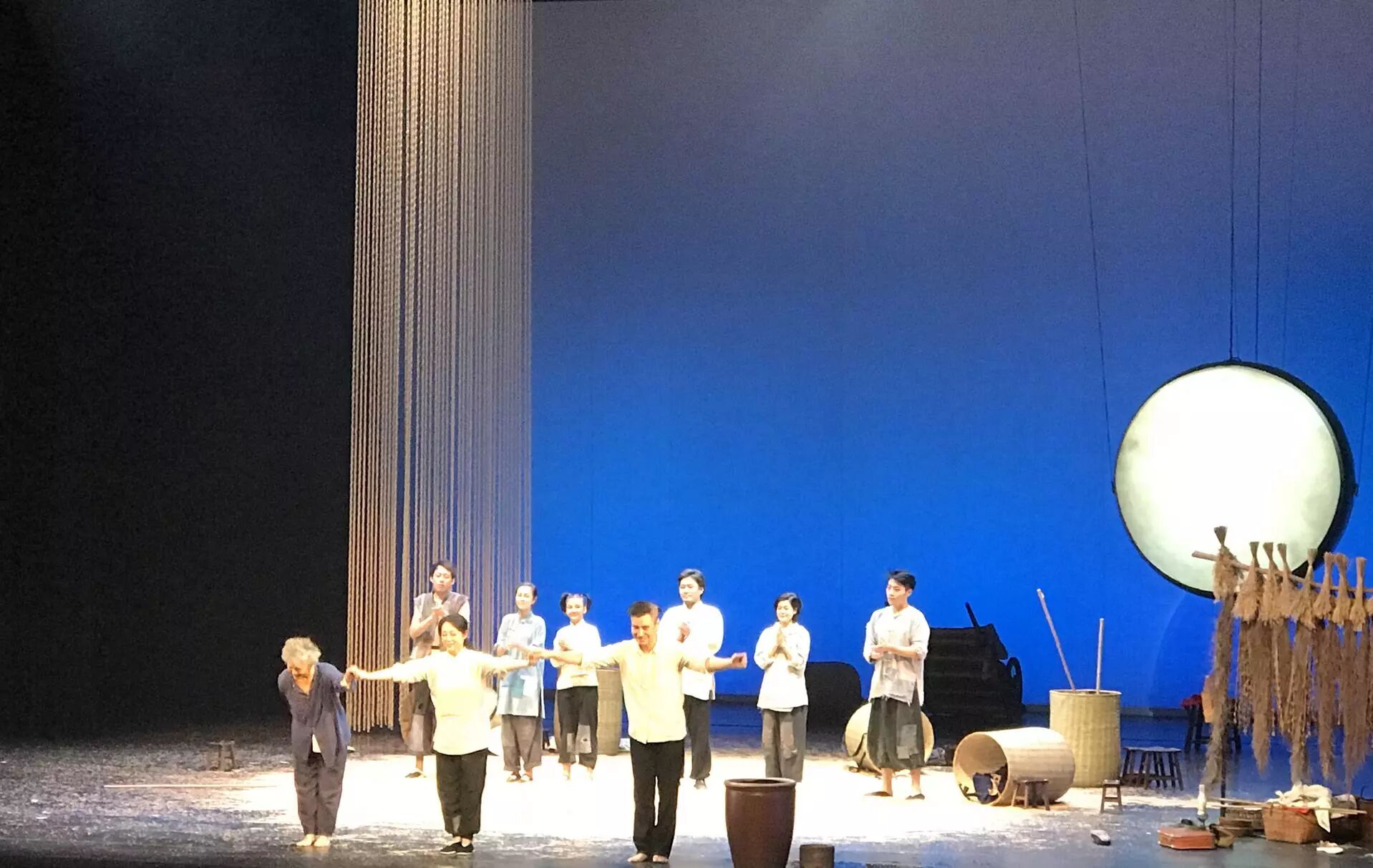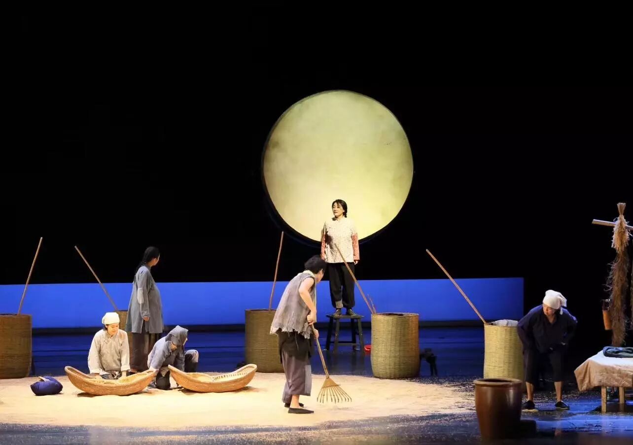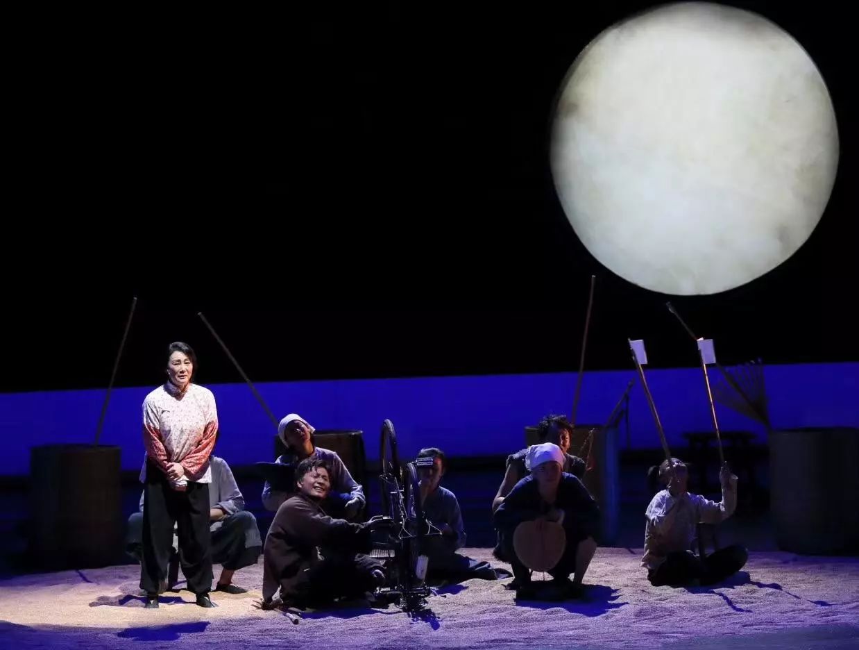麦场,石磙,笸箩,瓮,鼓,月亮,凉凉的,回声在田野漾着。整个舞台布置的定调在幕布拉开时就已经确定。整场演出中道具和布景再没有过多的变化。简洁的布景将演员的表现衬托得更有张力。