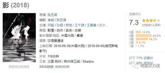 甚至电影这部分也开始逐渐涉及,去年参演了张艺谋的电影《影》,豆瓣评分7.3,过及格线。