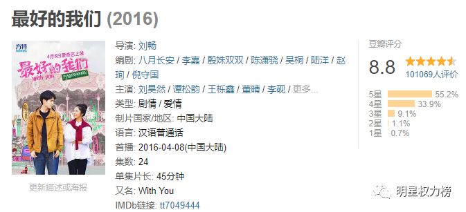 合作谭松韵的校园剧《最好的我们》豆瓣评分8.8,十万多观众评分,超过半数给出五星↓