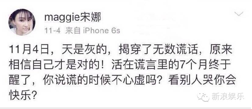在于和伟和王丽坤照片曝出的那天,也就是11月4号。宋娜发了这样的微博,说天是灰的,你说谎的时候不心虚吗?
