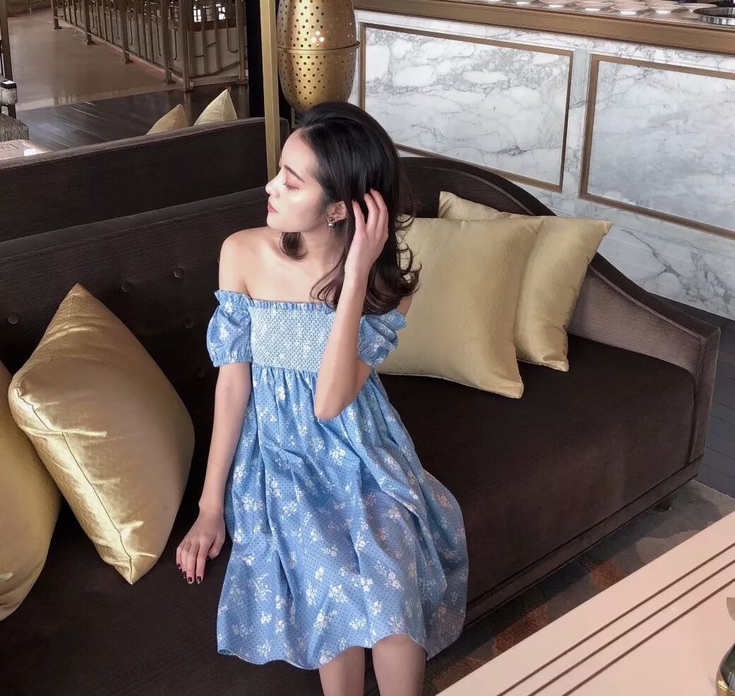 推荐你们首选纯棉哒~ 像允儿这件蓝色白碎花裙,即使是大大的V领,但因为衣服选择纯棉质地,所以看上去还是很清新。