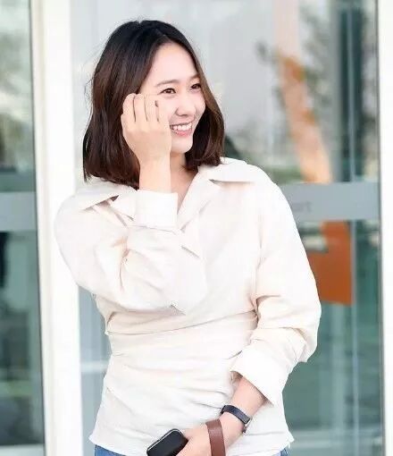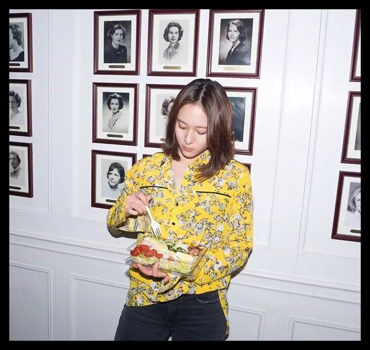 妹妹郑秀晶的穿衣风格是冷淡里还带着酷。这件姜黄色+白色碎花的衬衫版型是宽松的,配合大大的领子能遮住肉肉。这么穿怎么会有人说胖!