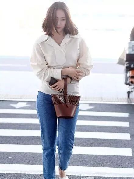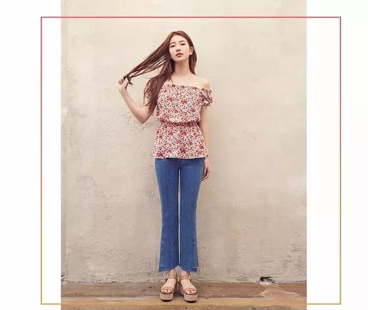 秀智那天还拍了这套guess露肩红碎花T+微喇水洗蓝牛仔裤,黄一觉得适合小个子女生借鉴~