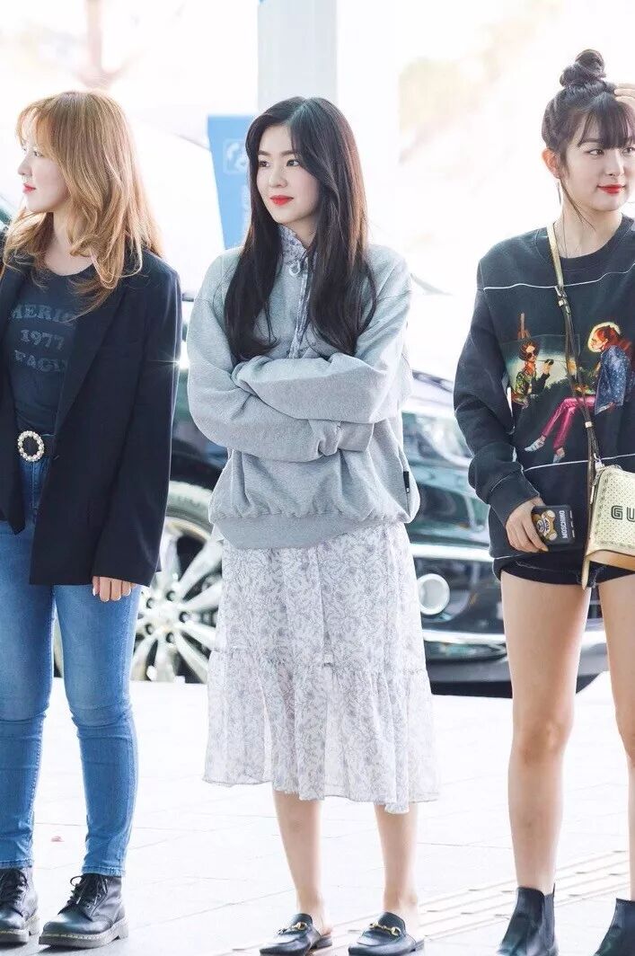 Irene用浅灰色卫衣套在白底碎花裙外面也很好看,记得裙子上面的系带要露出来噢!卫衣来自Boniee,上面印字all I listen becomes you,黄一还蛮喜欢的。