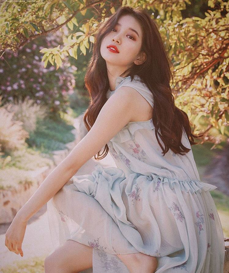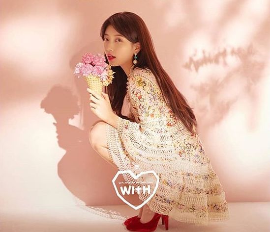除了上面雪纺裙,黄一发现秀智3、4月拍with的时还穿过一件同样类型但是有罩衫的。加了蕾丝更温柔,手捧着花可以直接去花田里踏春~