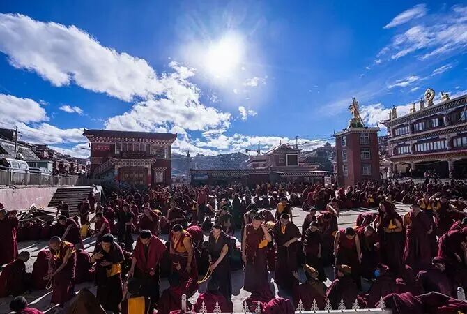 ▲佛学院里的僧众每天都会前往经堂诵经学习,每天各班学僧都要到大经堂辩论一小时,每月还有4天打破各班界限,自由进行辩论。通过激烈的辩论,能遣除思想中的错误概念,增长思维能力,交流各自所学心得。
