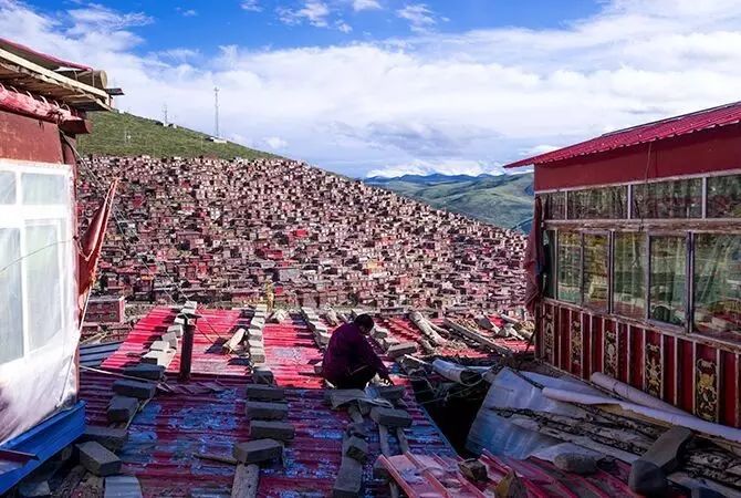 色达喇荣寺五明佛学院是目前世界上最大的藏传佛教佛学院,其僧舍很壮观,连绵数公里的山谷布满了密密麻麻的小木棚屋。谷底和山梁上分布着几座寺庙和佛堂,建筑规模虽都不很大,但装饰考究而辉煌;身披桨红色僧袍的喇嘛和尼姑来来往往,空气中充满生机和祥和气氛。