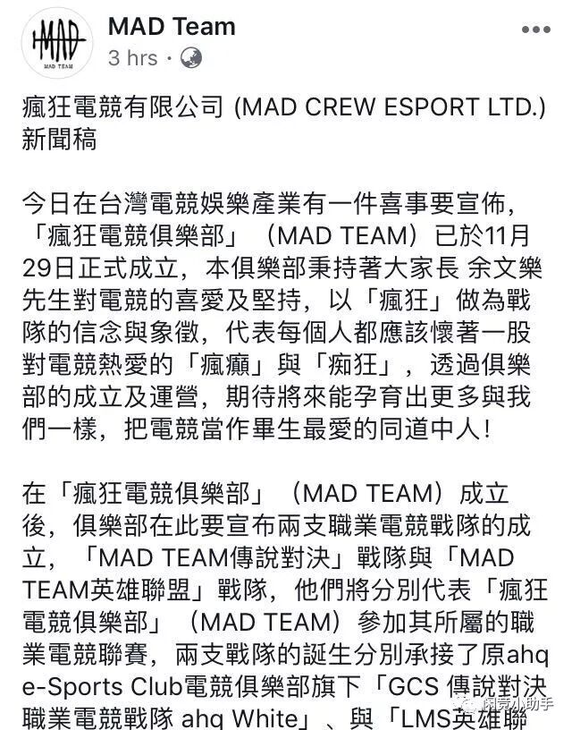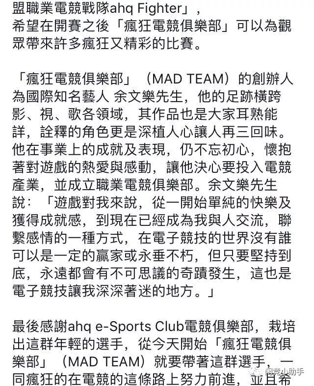 今天台湾一家新的电子竞技俱乐部宣布成立,稍有特别的是这家名叫MAD Team的新俱乐部是由著名影星余文乐创办的。