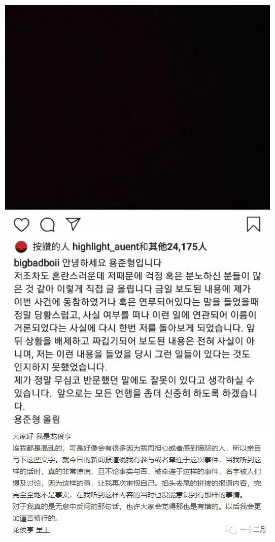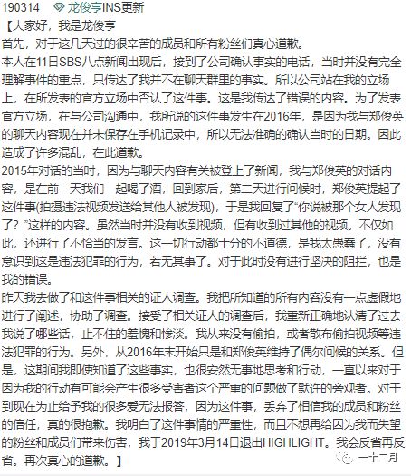 直到有一天在HIGHLIGHT超话里看到了龙俊亨所谓的澄清文。内容如下: