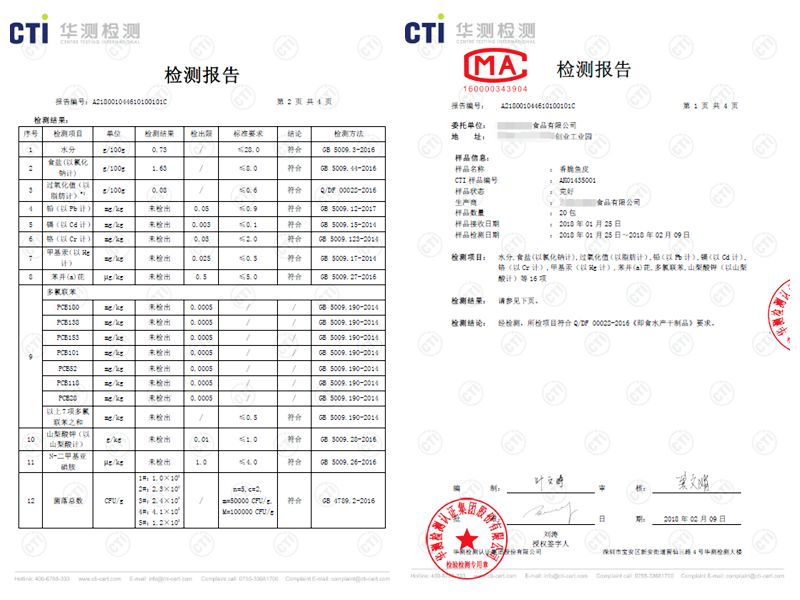 因为对供港产品要求极其严苛,每批鱼皮出厂都会有相关的检测报告。让大家都吃到放心的好食材。