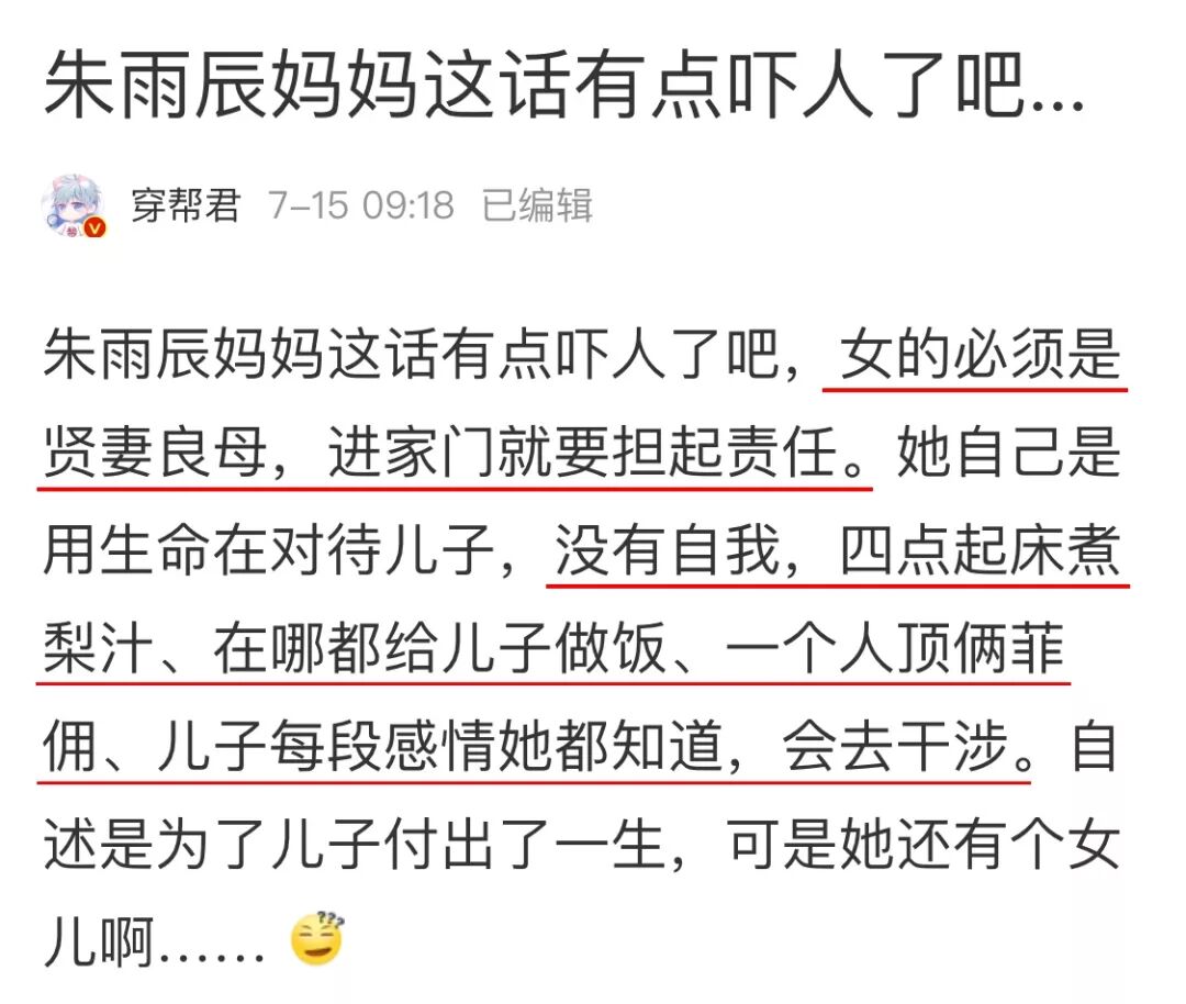 看起来像是赞同朱雨辰妈妈,其实是在提醒女生,嫁人之前一定考虑清楚。如果你能接受这种角色,那就嫁;如果接受不了,那就别嫁。