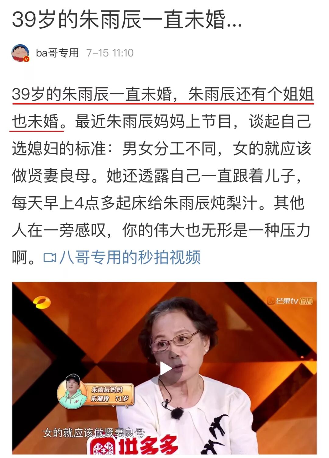 谈到朱雨辰39岁未婚的话题,朱妈妈非常自信地认为,自己的儿子很优秀,分分钟可以找到一个“贤妻良母”。