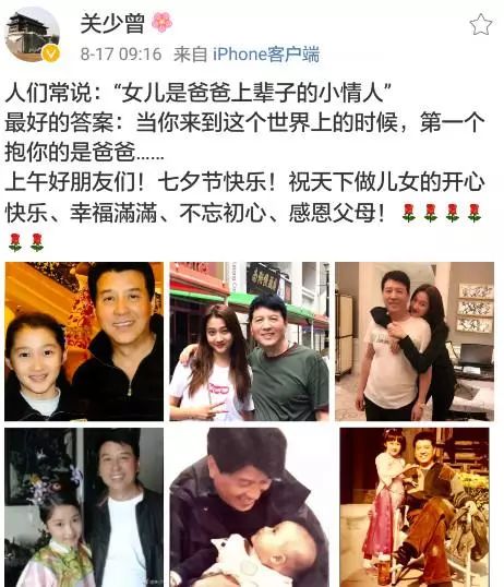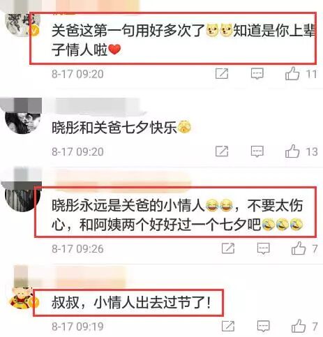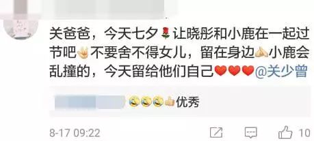 网友们纷纷留言调侃关少曾“关爸爸,这第一句用好多次啦,知道是你上辈子情人啦”“晓彤永远是关爸的小情人,不要太伤心,和阿姨两个好好过一个七夕吧”“叔叔,小情人出去过节了”“未来岳父吃醋了哈哈哈”