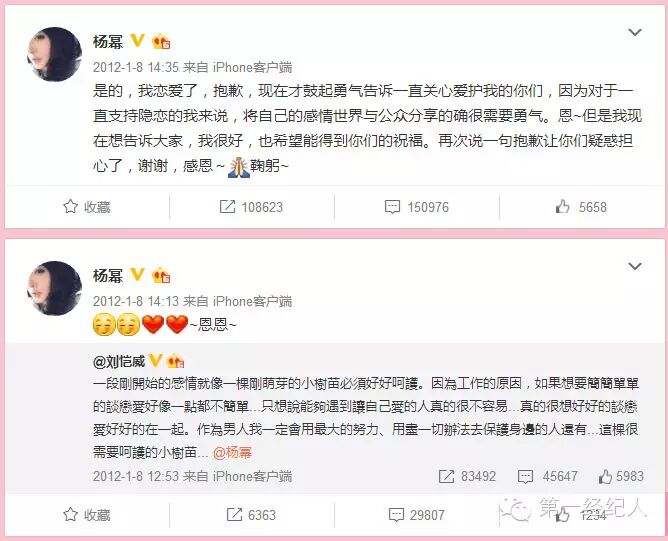 杨幂与刘恺威是在2012年1月18日两人微博公布恋情。
