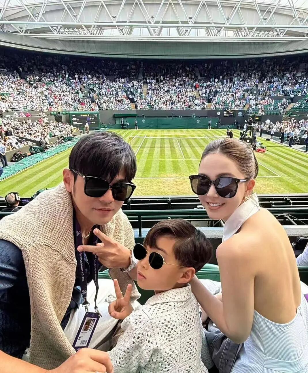 昆凌在社交平台晒出温网观赛全家福,照片里她和周杰伦戴着同款墨镜比耶。