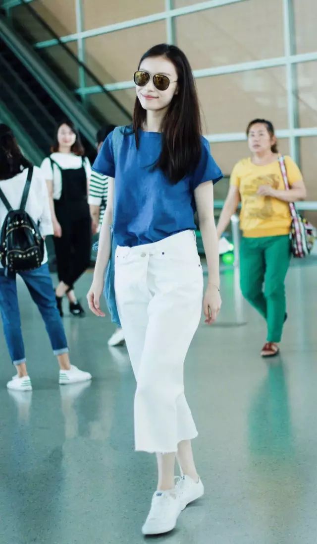 她并没有为了刻意凸显自己的好身材而选择穿修身露脐的T恤,宽松的白色七分阔腿裤恰如其分的既清爽又干练,搭配白色球鞋简直不能再好看!
