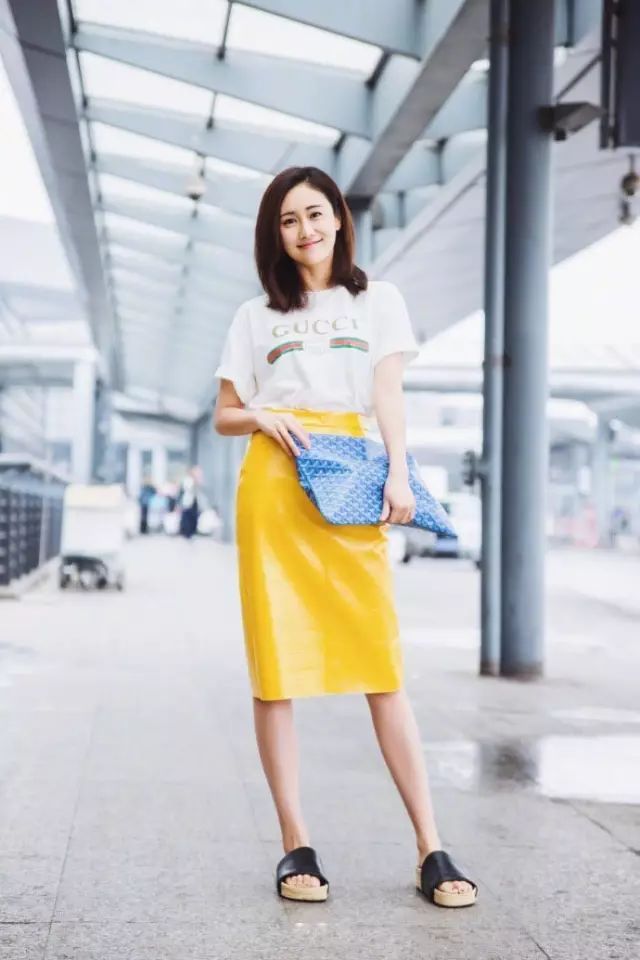 肤色偏白或健康的妹子其实还可以选择彩色T恤, 姜涩琪这套姜黄色&牛仔裤的搭配看起来有一点小复古,但是真的非常显白!