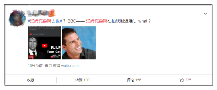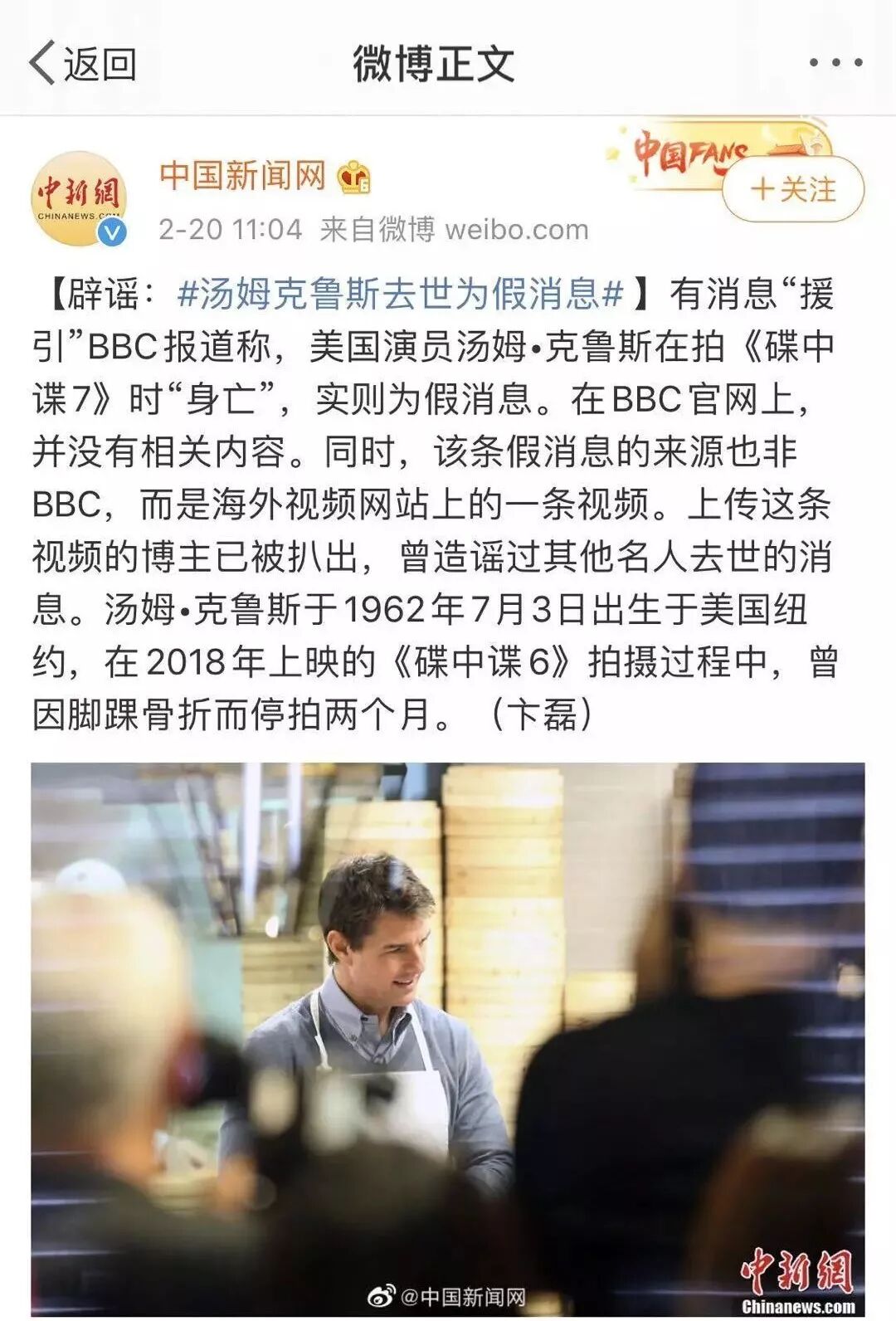 中国新闻网微博也发出辟谣的消息,声称“汤姆克鲁斯去世为假消息”。