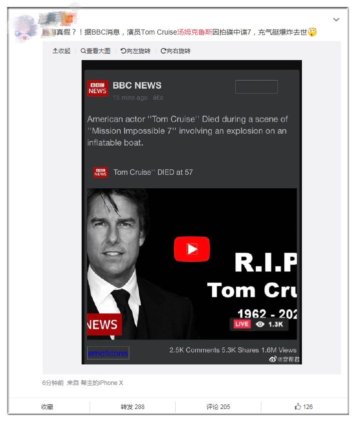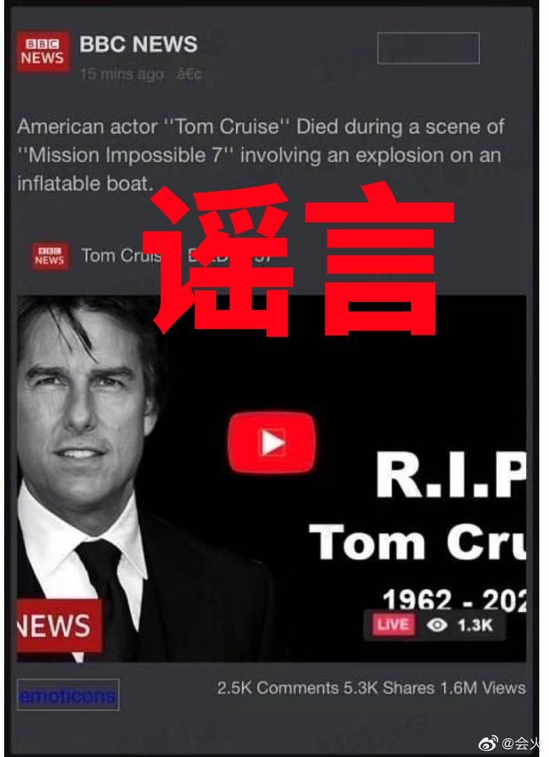 消息援引BBC的报道,称汤姆·克鲁斯在拍摄《碟中谍7》时,由于充气船爆炸而逝世。还配发了BBC NEWS的新闻配图!
