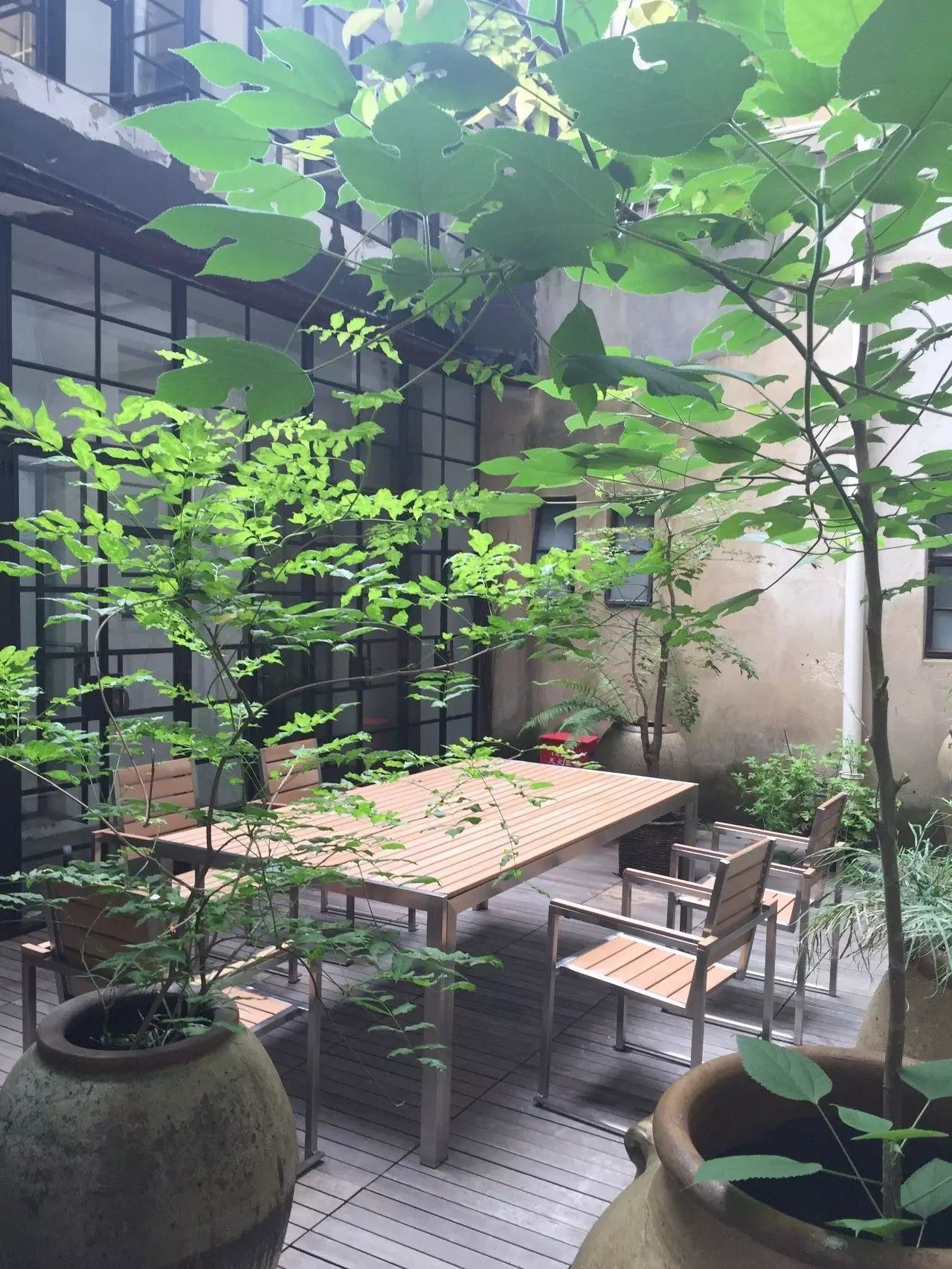吕燕的工作室,楼上楼下两个长廊三个天井和两个大露台,从花鸟市场淘来的大缸种植物和养鱼,工作之余也能听到鸟声蝉鸣。一步之遥,就能从紧绷的工作状态走到阳台吹吹风,甚至能闻到隔壁邻居美味佳肴散发的香味。一层主要是被用来放置打样、裁缝台等设备,一应俱全。吕燕的个人办公室位于二层,一走出来就是个大露台,不论晴雨,各有风景。轻松的氛围下,创意灵思自然水到渠成。
