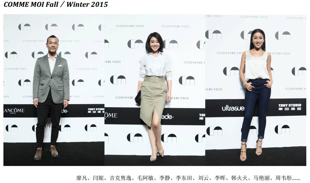 2015年4月28日,“COMME MOI2015秋冬”服装秀在北京长安街银泰博悦酒店登场,现场汇集了李东田、邓超、闫妮、廖凡、袁泉、吉克隽逸、马艳丽、周韦彤等明星。为大秀领衔跨刀的更是红透国际T台的超模杜鹃、游天翼及一众世界名模。