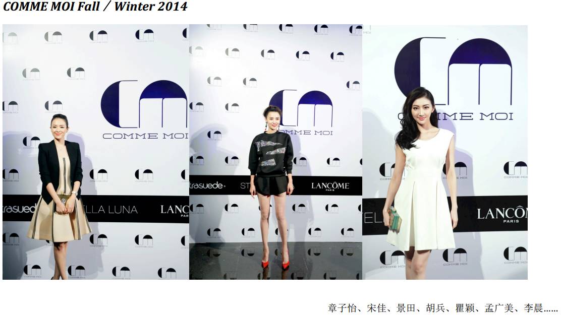 2014年7月1日,Comme Moi于北京博悦酒店发布2014秋冬系列女装。章子怡、景甜、宋佳、孟广美、马艳丽、胡兵、瞿颖等明星到场。“Comme Moi 2014秋冬系列”,是这位超模设计师私人风格的一次写照。简洁流畅、干练精致,带点无伤大雅的摇滚气质和年轻随意的运动感。