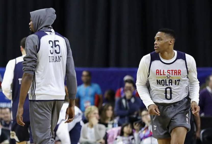 韦少与杜兰特再度成为队友,这是本届全明星的一大热点。两位球星对于这个话题颇为忌讳,接受采访闭口不谈,两人见面都躲着走。在全明星周末活动期间,有一次韦少和杜兰特在球馆通道相遇,韦少连忙转向一旁,杜兰特则低下头没有按照工作人员指示的道路从韦少面前经过,而是绕了一下路,从韦少背后走了过去,两人都将对方当空气。